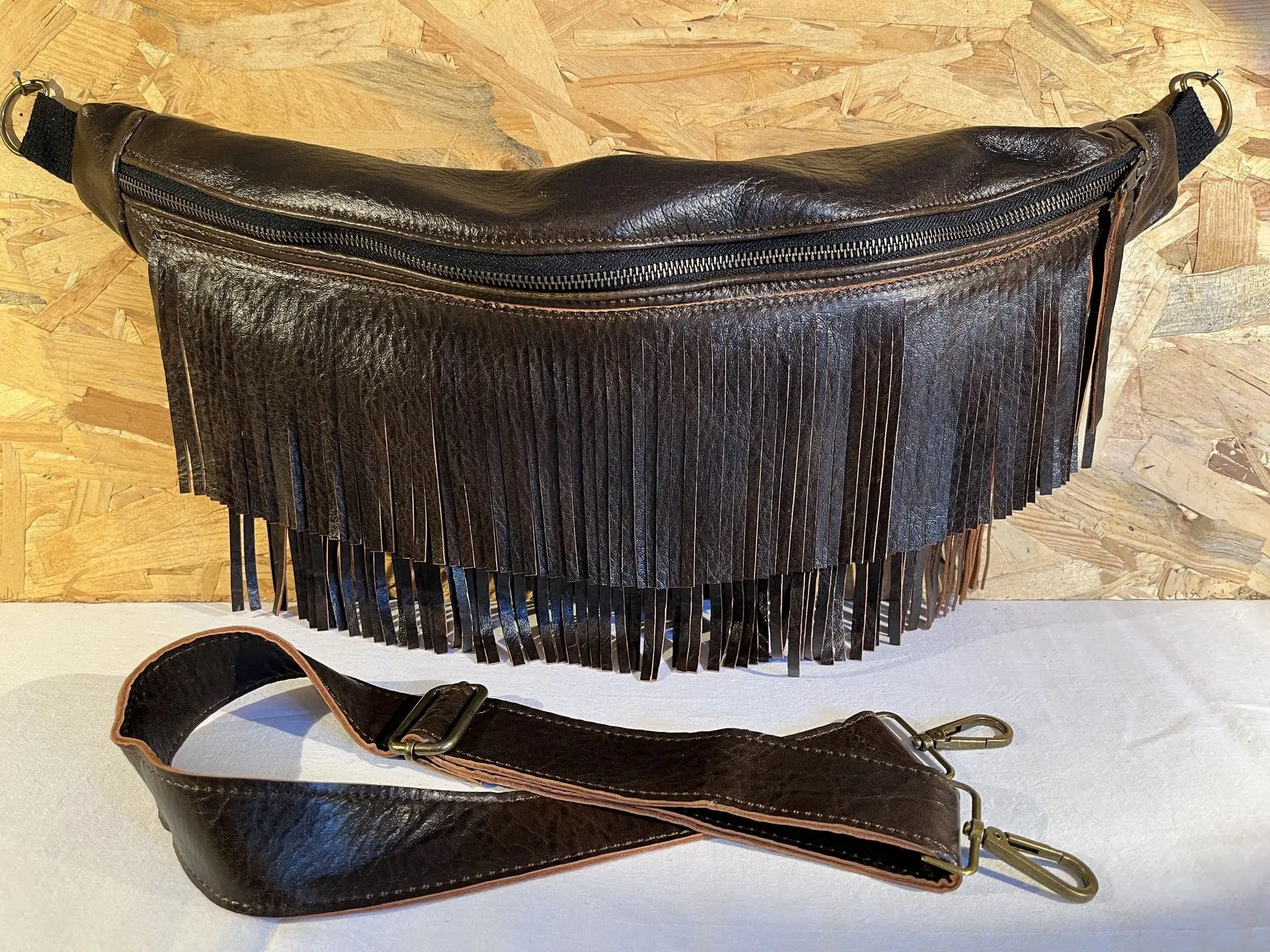 En cuir, orné de franges, une doublure intérieure noire en coton avec deux poches plaquées.Ce sac a été conçu pour celles et ceux qui souhaitent garder les mains libres tout en affichant un look affirmé.