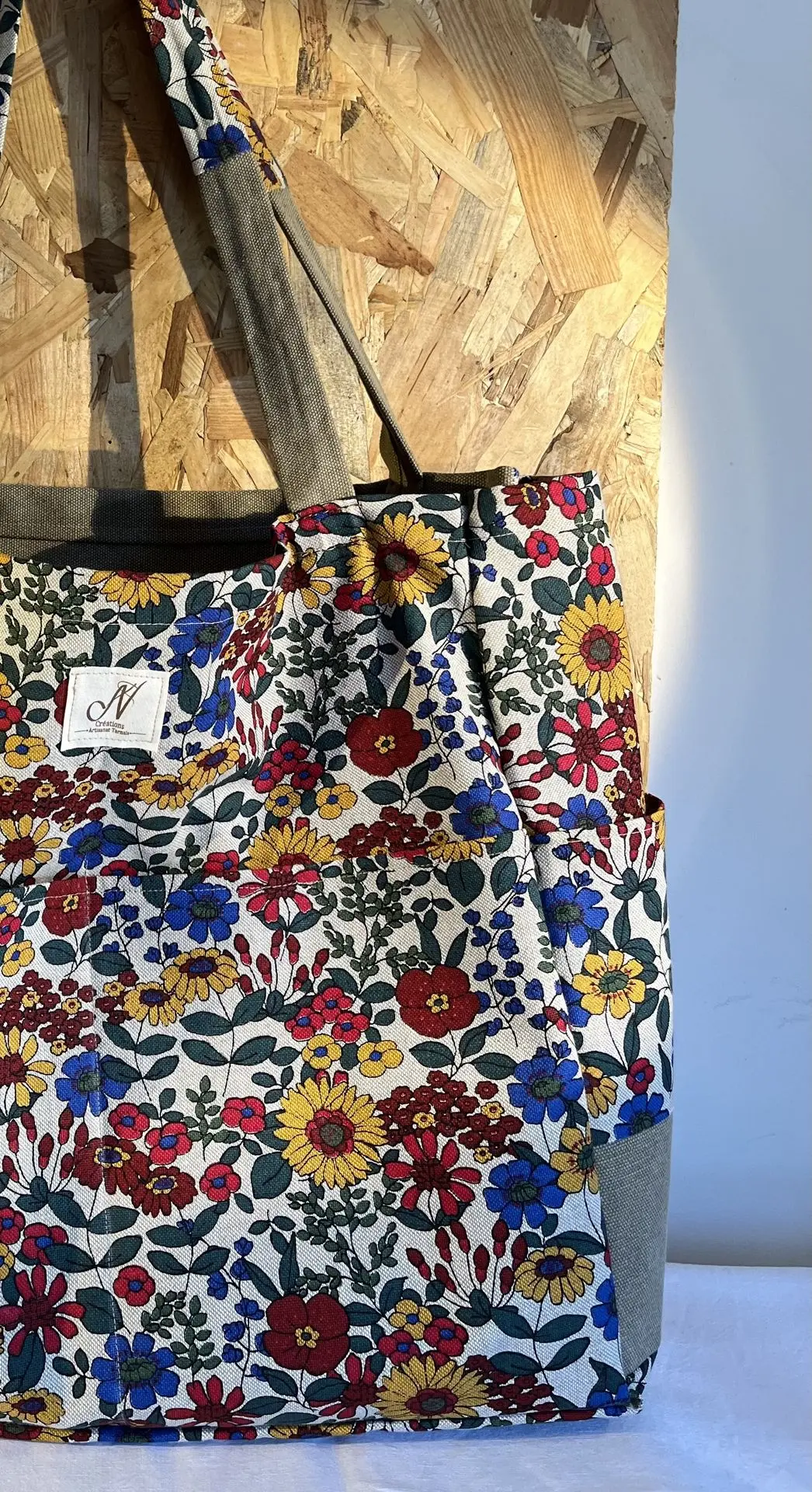 Un sac cabas polyvalent en tissu non doublé, doté de deux poches à l’avant, une poche de chaque côté et une poche fermée à l’arrière, un mousqueton à l'intérieur du sac pour accrocher vos clés.